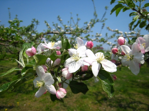 リンゴ(林檎)はバラ科の果樹で、春になると淡いピンクを帯びた白い花を咲かせます。