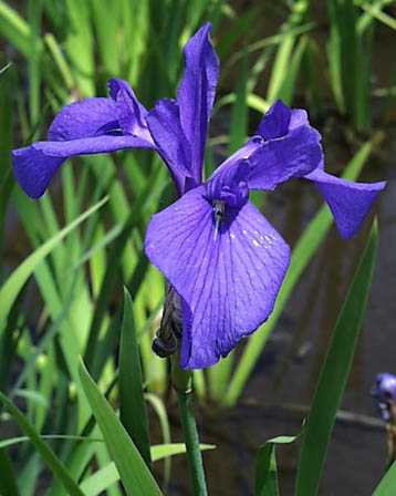 静かな水辺に群れ咲く、凛とした青紫の花です。